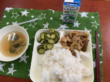 ごはん、ホイコウロー、中華スープ、きゅうりのピリ辛あえ、牛乳