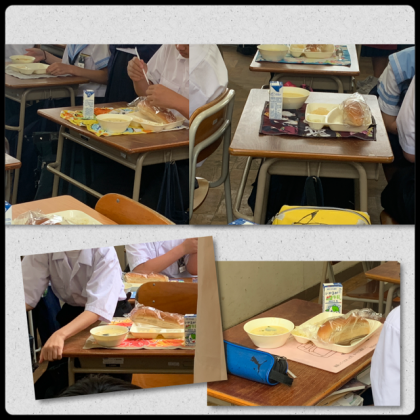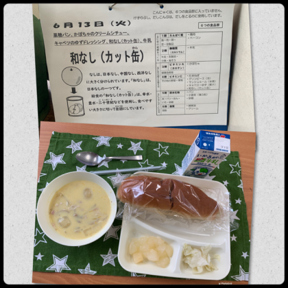 黒糖パン、かぼちゃのクリームシチュー、キャベツのゆずドレッシング、牛乳