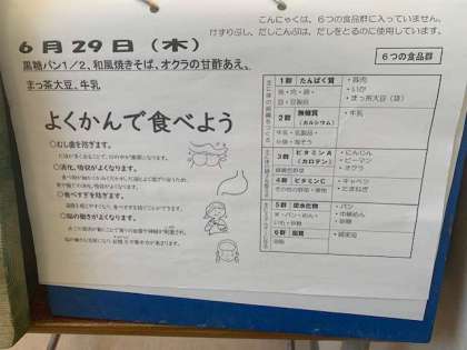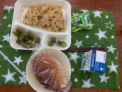 黒糖パン、和風焼きそば、オクラの甘酢あえ、まっ茶大豆、牛乳