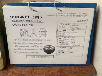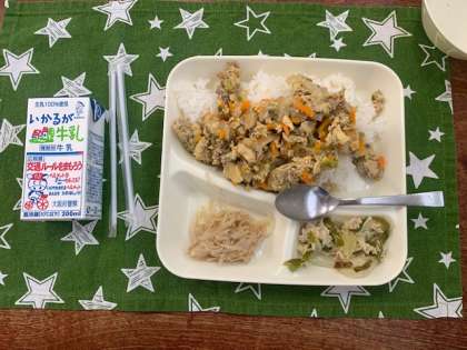 他人丼、ささみと野菜のいためもの、もやしの甘酢あえ、牛乳
