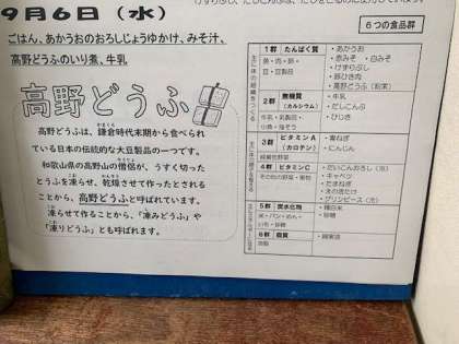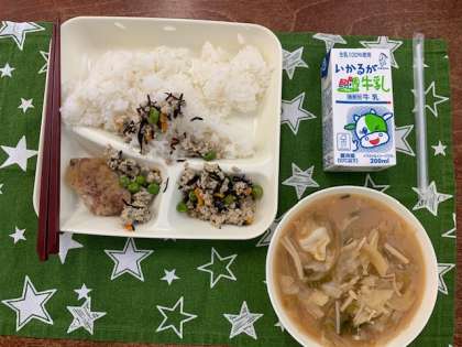 ごはん、あかうおのおろしじょうゆかけ、みそ汁、高野どうふのいり煮、牛乳