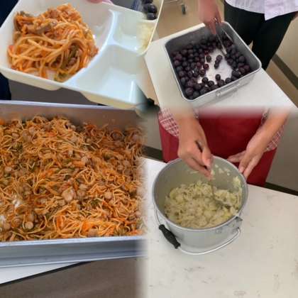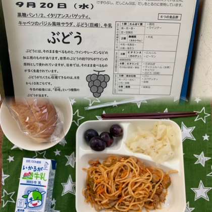 黒糖パン、イタリアンスパゲッティ、キャベツのバジル風味サラダ、ぶどう、牛乳