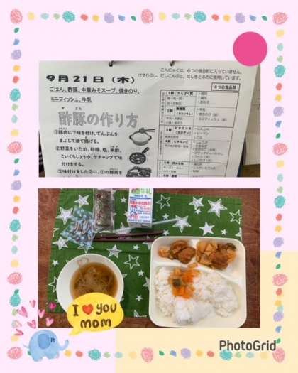 ごはん、酢豚、中華みそスープ、焼きのり、ミニフィッシュ、牛乳
