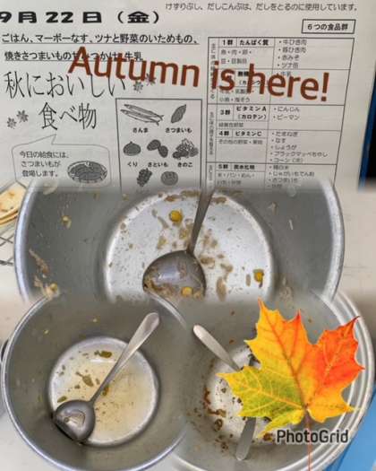 ごはん、マーボーなす、ツナと野菜のいたメモの、焼きさつまいもの甘みかけ、牛乳