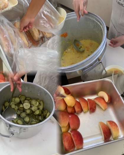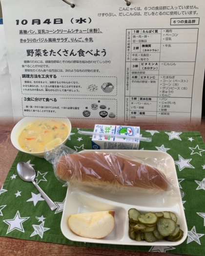 黒糖パン、きゅうりのバジル風味サラダ、りんご、牛乳