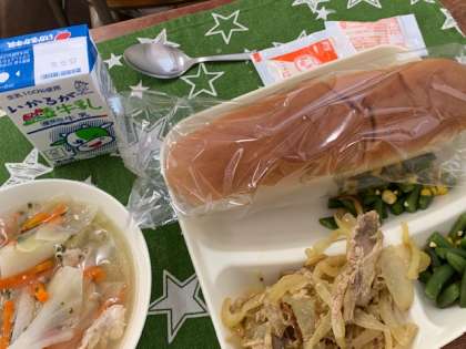鶏肉と野菜のスープ、サンドまめとコーンサラダ