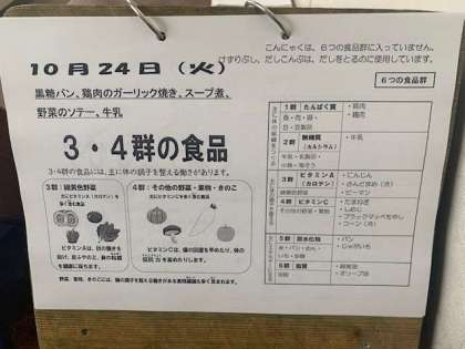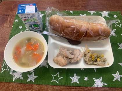 黒糖パン、鶏肉のガーラック焼き、スープ煮、野菜のソテー、牛乳