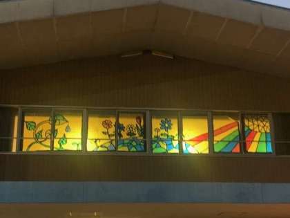 体育館窓枠に飾られたステンドグラス