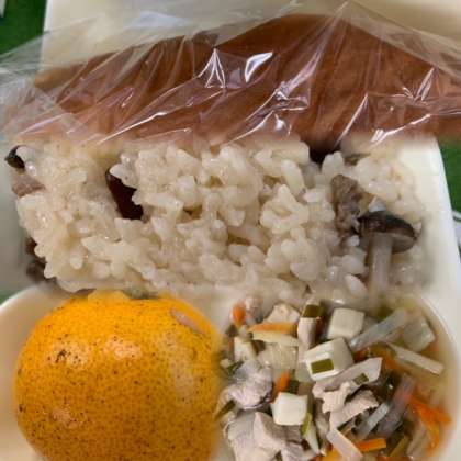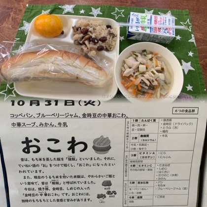 コッペパン、ブルーベリージャム、金時豆の中華おこわ、中華スープ、みかん
