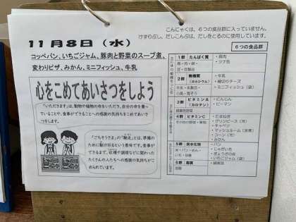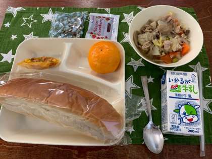 コッペパン、いちごジャム、豚肉と野菜のスープ煮、変わりピザ、みかん、ミニフィッシュ、牛乳