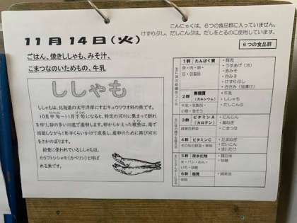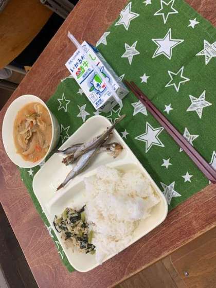 ごはん、焼きししゃも、みそ汁、こまつなのいためもの、牛乳