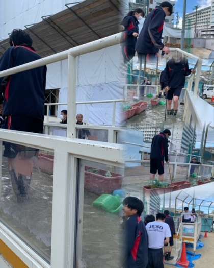 洪水状態での水流の勢いや沈下物の障害性を体験します。