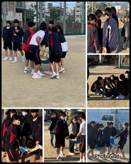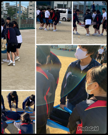 5人一組で布などを使い簡易担架を作って搬送体験を行います。