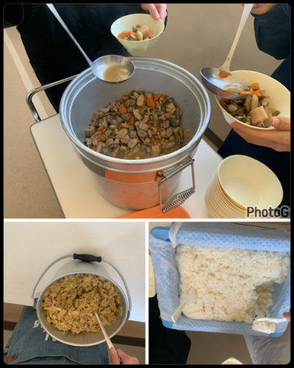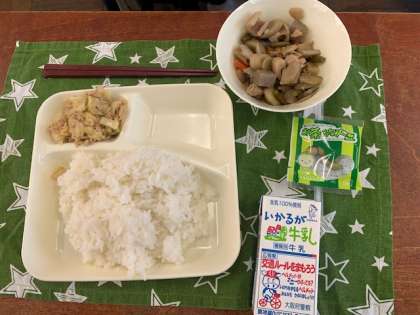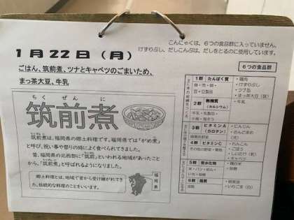 筑前煮、ごはん、ツナとキャベツのごまいため、まっ茶大豆、牛乳