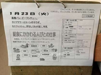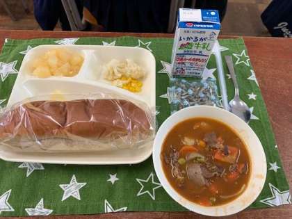 黒糖パン、ビーフシチュー、カリーフラワーとコーンのサラダ、ミニフィッシュ、洋なし、牛乳
