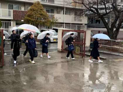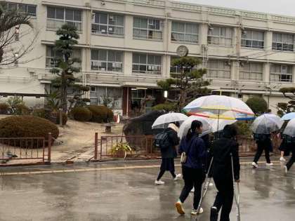 今日は、朝からあいにくの雨模様。生徒が登校する頃も雨が降り続いており、傘をさしての登校です。