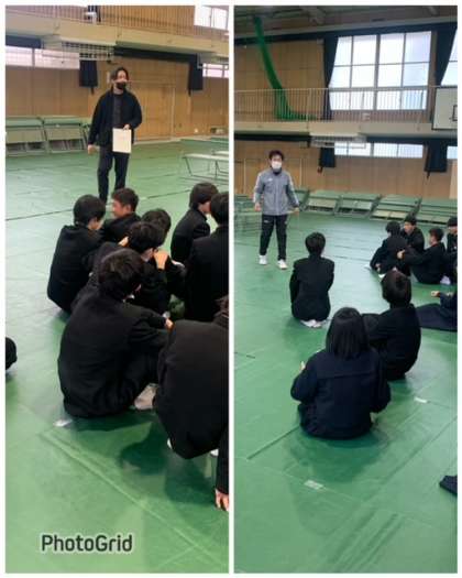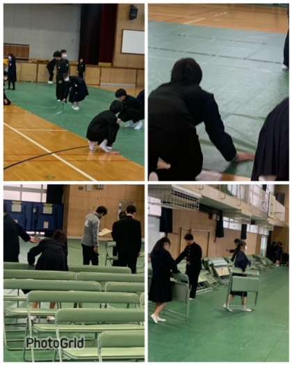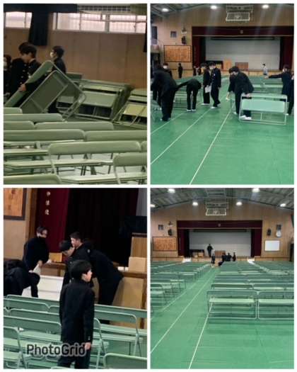 クラス全員で卒業式を行う体育館の会場準備を行いました。3年生に感謝の気持ちを込めて準備を行いました。