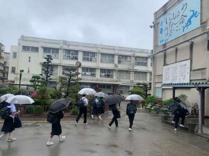 雨の中傘をさしての登校です。