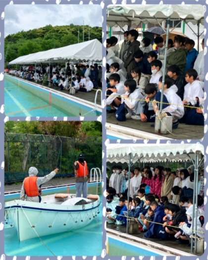 ?今日と明日に行うカッター訓練の説明を、施設の方からプールで行いました。