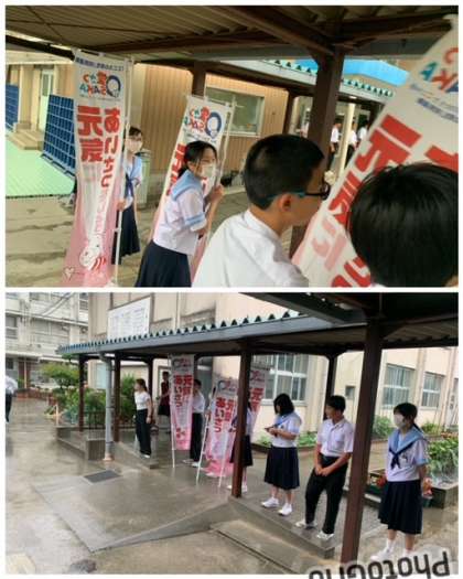 本日よりあいさつ運動がスタートしました。当番は1組です。