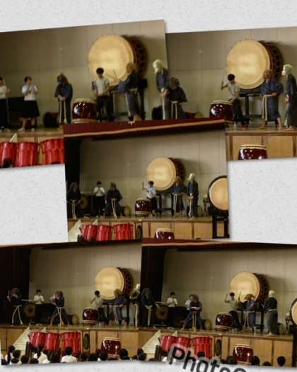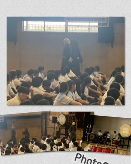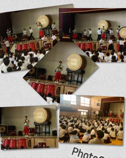 3名の生徒と先生が舞台上に連れて上がり、鬼のレクチャー通り太鼓を打ちます。