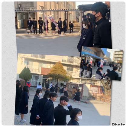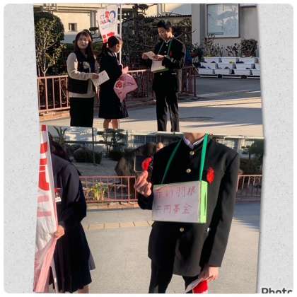 寒い中、生徒会が赤い羽共同募金を実施しています。呼びかけに生徒と先生が応えてくれていました。