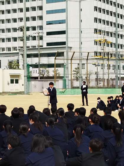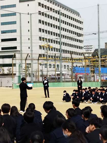 始業式に引き続き、グラウンドにて対面式を行いました。