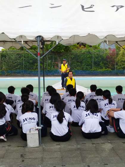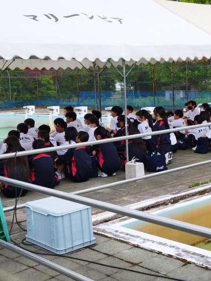 入室が済み、施設プールにてカッターの説明を聞いています。この説明後にカッター訓練、磯観察、アスレチックの体験活動に入ります。