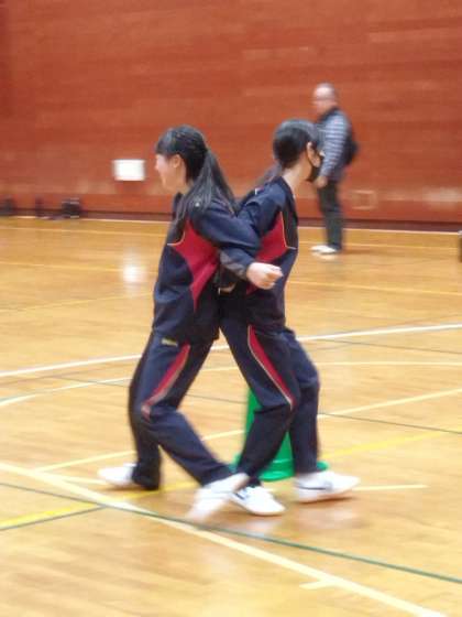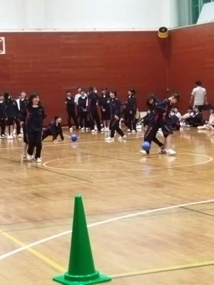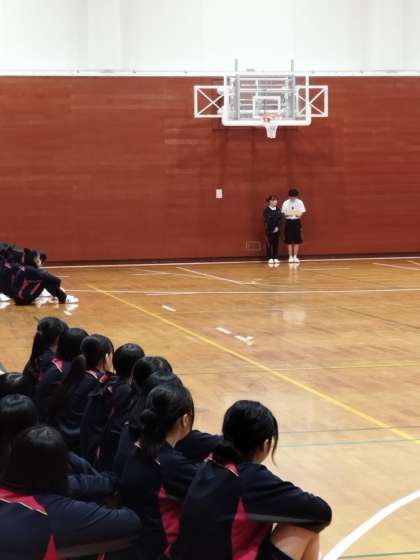 レク係の生徒の進行で、夜のレクリエーションが始まりました。最初の競技はボール運びです。2人でボールを背中に挟んで競走します。息を合わせて、落とさないように頑張ってください。