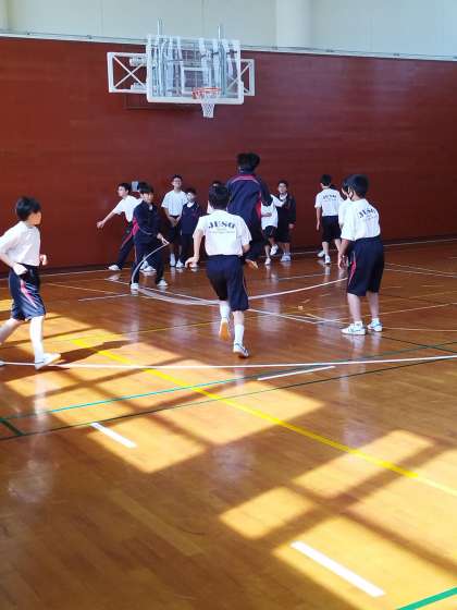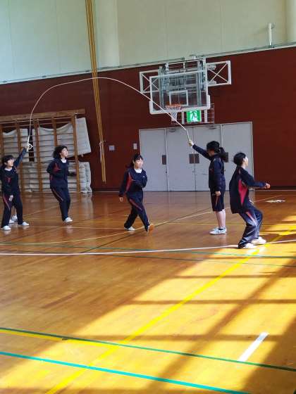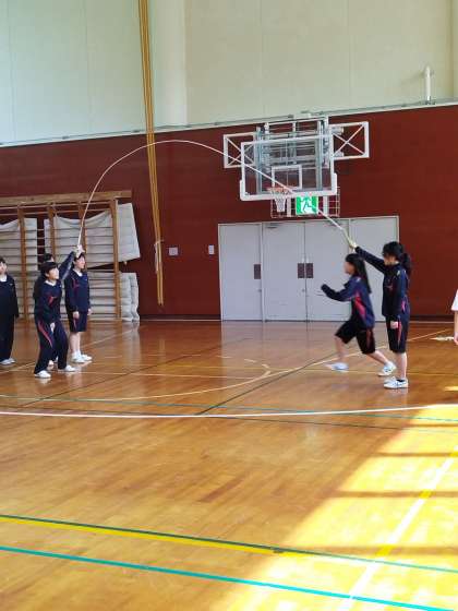 写真は体育館で大縄をしているグループの様子です。慣れてくると連続で回数を重ねることができるようになりました。