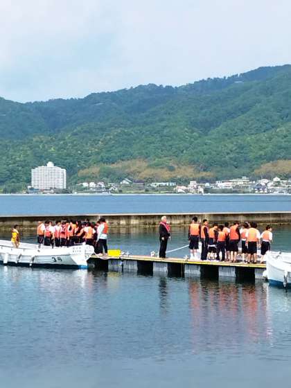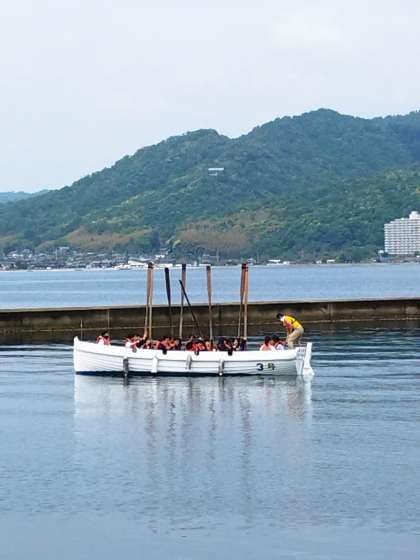 昨日に引き続き、カッター訓練をしています。今日は3艇でレースをします。