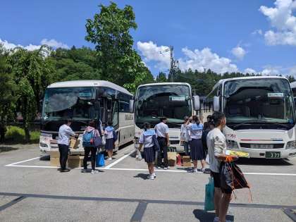 高山散策が終わり、民泊場所別に乗車しています。これから郡上での民泊が始まります。