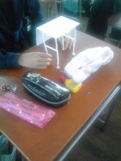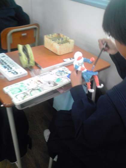 どんどん作業が進んでいます。最初はあまり乗り気でなかった人も真剣になってきました。ひとつひとつのパーツ(部品)は小さなものですが、ひとつに集まると見事な教室が出来上がりそうです。乞うご期待!(上:生徒 中:黒板 下:机 特に黒板はなかなかリアルですね)