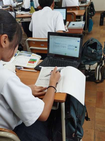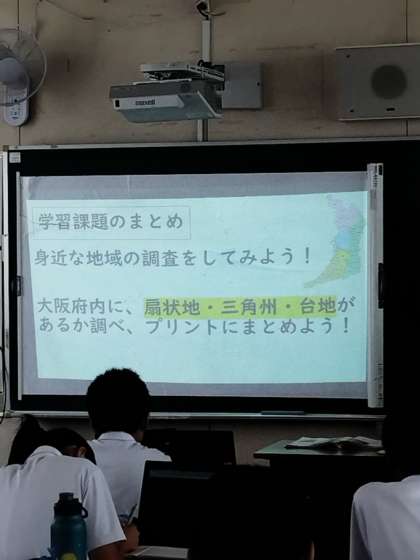 2限目、2年生の社会の研究授業が行われました。地理分野の地形についての学習でした。前半は扇状地や三角州のでき方やそれぞれの土地がどのように利用されているのか勉強しました。後半はパソコンを使って調べ学習をし、発表をしました。