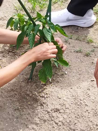 同じく1限目、くすのき学級でも研究授業を行いました。ピーマンの三本仕立ての農園作業でした。暑い中での作業でしたが、支柱3本と誘引ひもで枝を上手に固定することができました。
