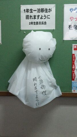 5/9(月)〜11(水)は梅雨のような天気。2年生の委員長会が『1年生の一泊移住が晴れますように』と願いを込めて、大きな“照る照る坊主”を掲示してくれました。2年生掲示板にあるので、照る照る坊主を見た1年生は少ないと思いますが、先輩は見守ってくれています。