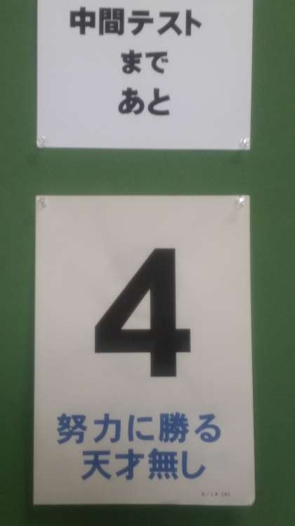 5月20日(金)23(月)は中間テストです。テストへ集中するために、学年掲示板にてカウントダウンしています。努力は嘘をつきません。コツコツと努力を重ねましょう。目標に向かっているときの姿勢、人間がひとまわり大きくなる瞬間です。