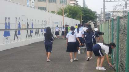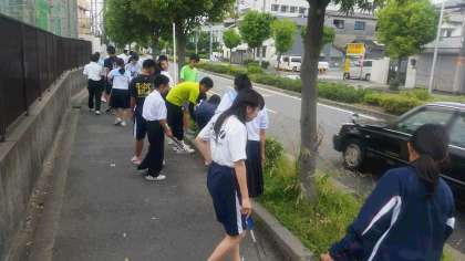 生徒会主催の“クリーン作戦”を展開しました。この奉仕活動では、各学級の委員長と各種委員長が集まり、学校周辺と野中南公園を清掃します。学期に1回は、十三駅周辺も清掃します。本校は教育活動全般を通して、ボランティア精神を育成しています。