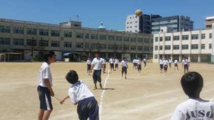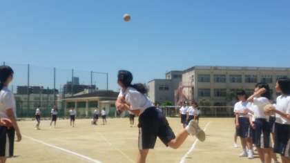 晴天のもと青空にハンドボールが吸い込まれていきます。1年生の“ハンドボール投げ”です。1年生女子の最高は25m、男子は33mです。今後が楽しみ!