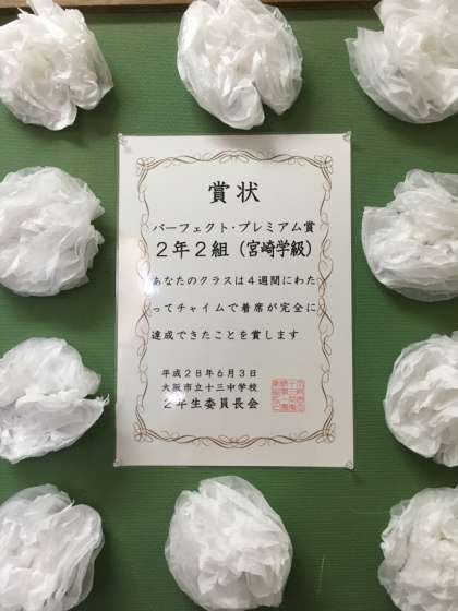 チャイムでしっかり自席に座り、授業を受ける態勢を整える……当たり前ですが大切なことです。各クラス、委員長の厳しいチェックのもと、チャイム着席をみんなで心がけ、連続して達成をしているクラスを表彰しています。