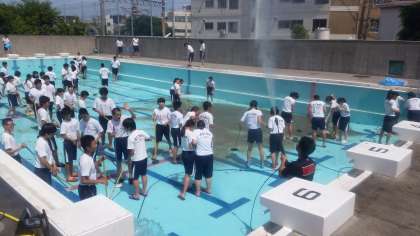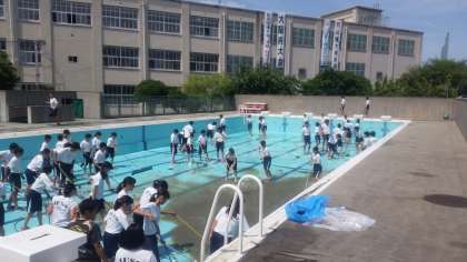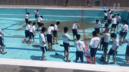 6/8(水)梅雨の晴れ間に、3年1〜3組によるプール清掃。3年生はよく働きました。今日は2年1〜3組による仕上げ作業です。