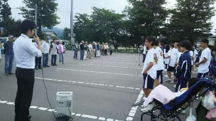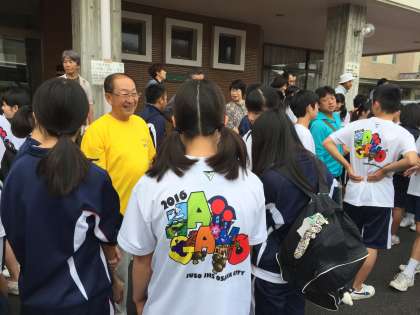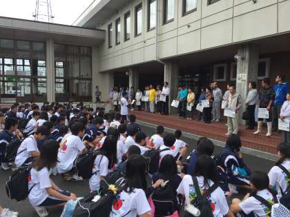 全生徒、元気いっぱいです。感謝の気持ちを離村式で表明しました。笑顔で『さようなら!』。これから、待ちに待ったラフティングに出発です。