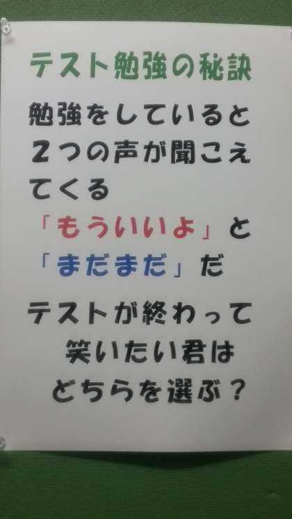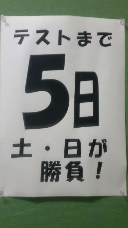 期末テスト、5日前です。土日に○時間/48時間、テスト勉強。家庭で真剣な姿を見てください。