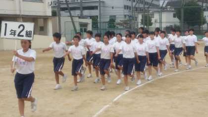 2年生の行進は徐々に上達してきました。努力は嘘を就きません。体育大会当日、全行動の美しさを見てください。(注)プラカード“1年2組”を持っていますが、行進しているのは2年2組です。