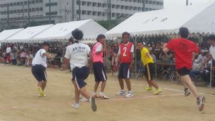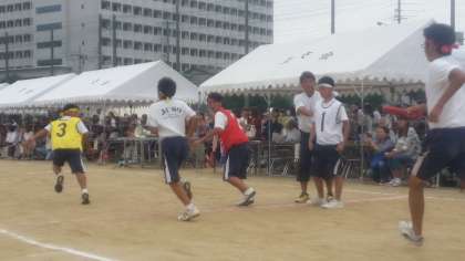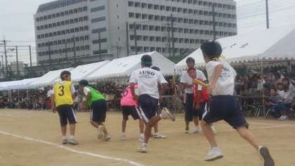 男子の800mリレーです。さすがに中学校3年生は速い!教職員チームも歯が立たず。残念!無念!