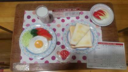 主食・主菜・副菜のバランスの良い朝食サンプルが提示され、生徒は興味津々でした。バランスのとれた朝食をとり、脳を活性化させると学習の理解度が深まります。毎日朝食を取るようにしませう!