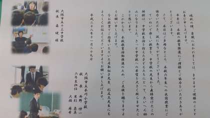 滑らかに中学校に接続し充実した中学校生活が送れることを目的として、小中連携を強化しています。その一環として11月29日に大阪市立木川小学校へ出前授業(音楽と理科)に赴きました。その後、小学校から丁寧な礼状が届き、出前授業を担当した教員も、心より喜んでいました。4月の入学式、十三中学校全教職員で新入生を歓迎します!
