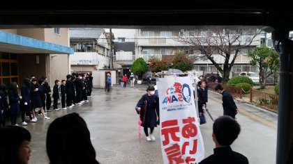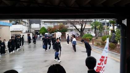 生徒会や各委員長は『雨ニモ負ケズ、寒サニモマケヌ、丈夫ナカラダヲモチ』一生懸命(いっしょうけんめい)あいさつ運動に参加しています。(かっこいい!)