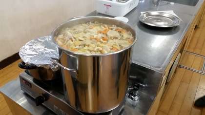 温かい心のこもった豚汁、完成です。冷え切った身体をあたためてくれるでしょう。PTA役員・実行委員の方々、調理ありがとうございました。生徒も『感謝の心』でいただきましょう。