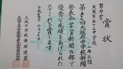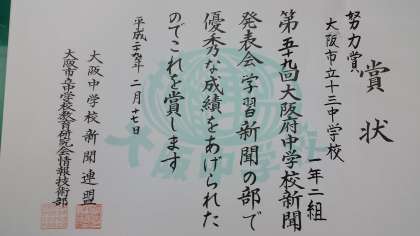 大阪中学校新聞連盟主催の新聞コンクール(学級新聞の部)にて、努力賞に輝きました。受賞理由は以下の通りです。